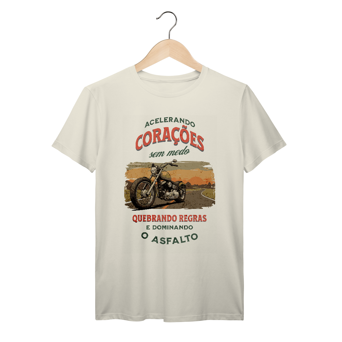 Estampa: Mais que uma arte, é a alma da estrada. A estampa mostra a liberdade em sua forma mais pura: uma moto clássica sob o vasto horizonte, com o sol se pondo no asfalto que se estende ao infinito. As cores quentes e o design nostálgico resgatam a sensação de paz e aventura que só a estrada oferece.