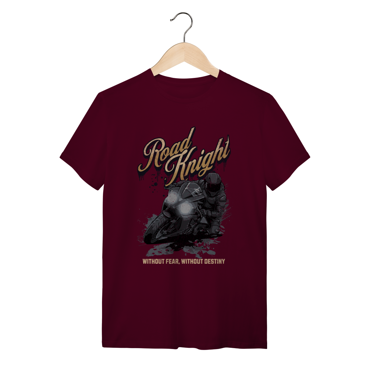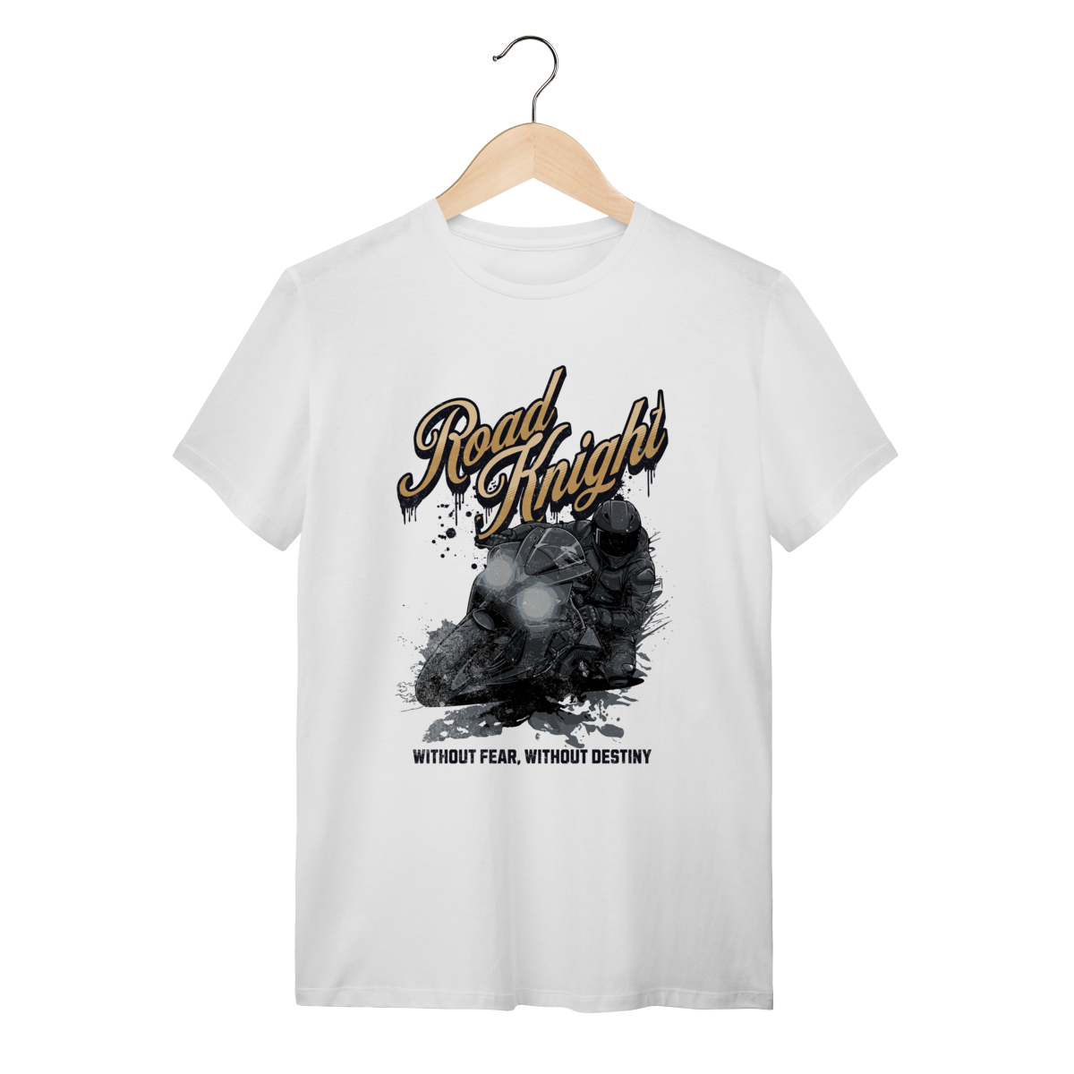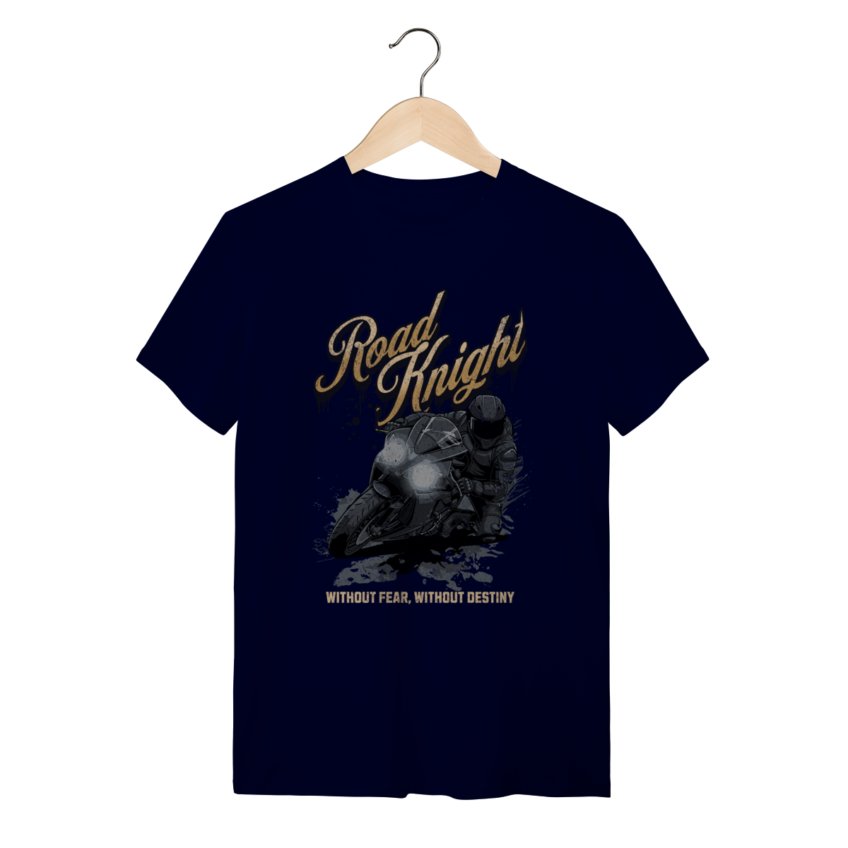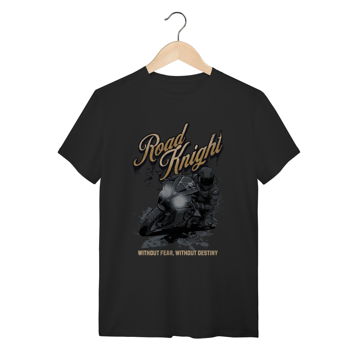 Estampa: Perfeita para quem vive a vida sobre duas rodas. Com a frase "Road Knight" e o complemento "Without Fear, Without Destiny", a estampa captura a atitude destemida e o estilo de vida de quem domina o asfalto.