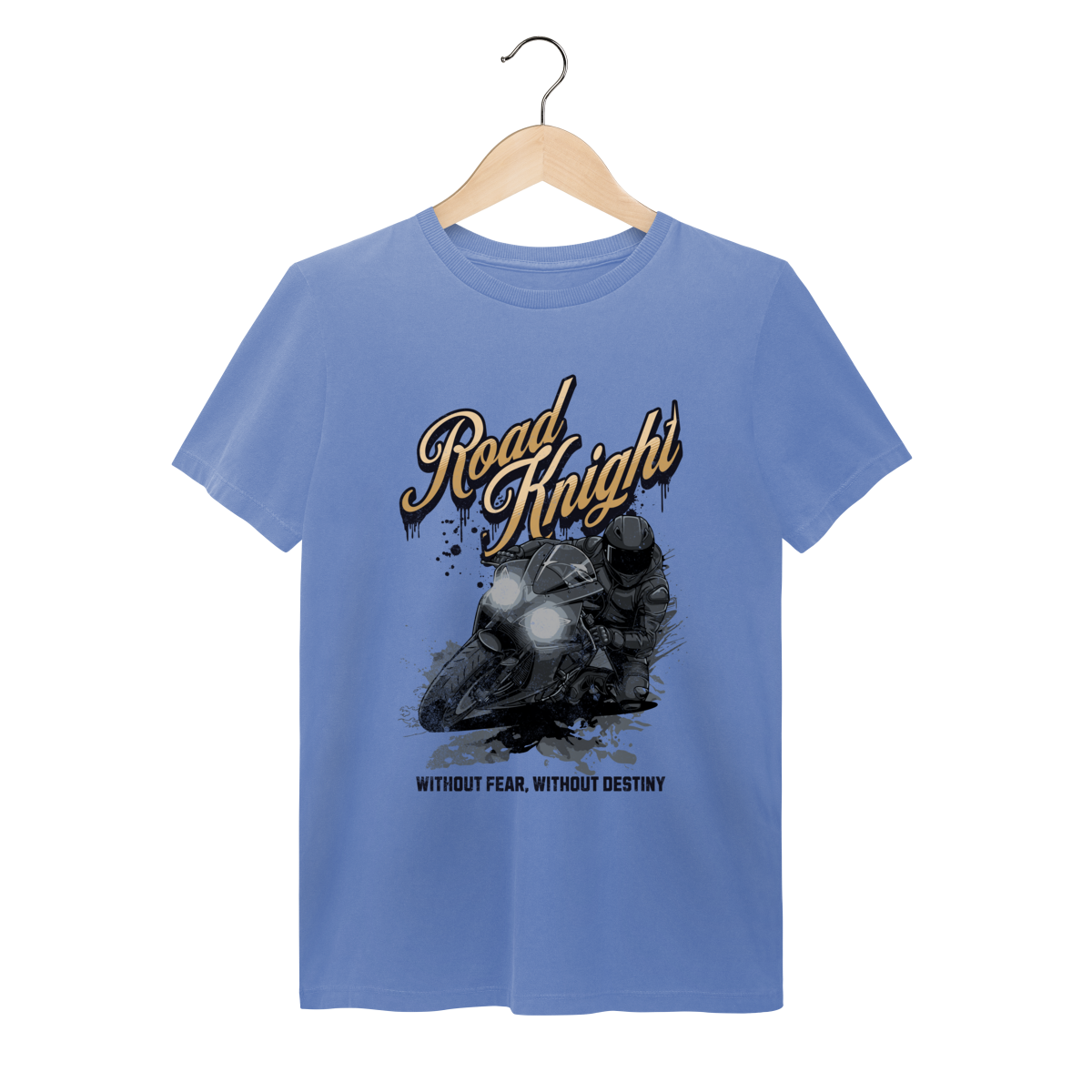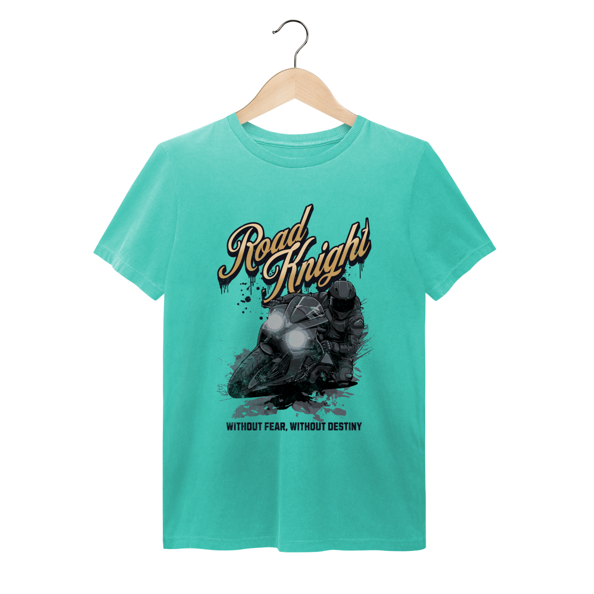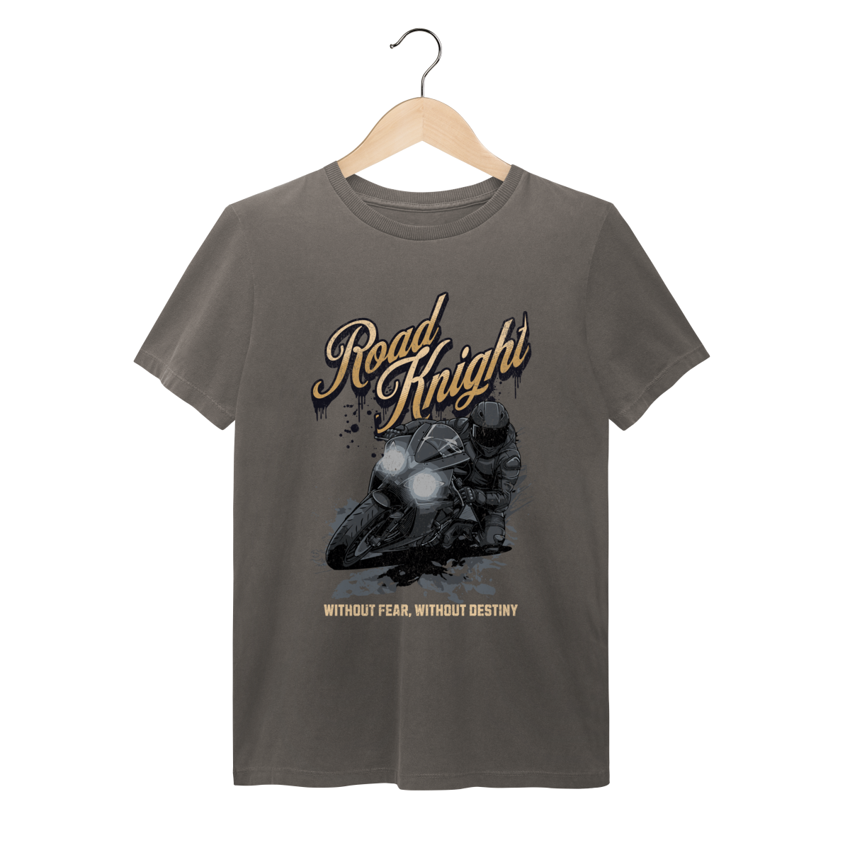 Estampa: Perfeita para quem vive a vida sobre duas rodas. Com a frase "Road Knight" e o complemento "Without Fear, Without Destiny", a estampa captura a atitude destemida e o estilo de vida de quem domina o asfalto.