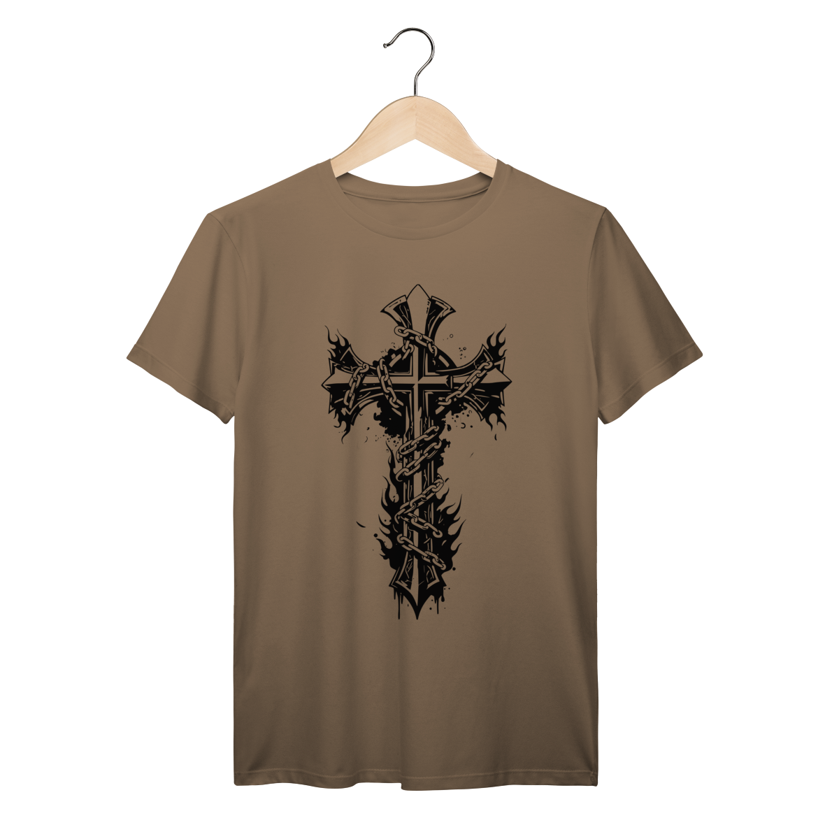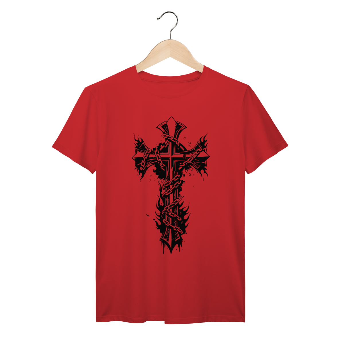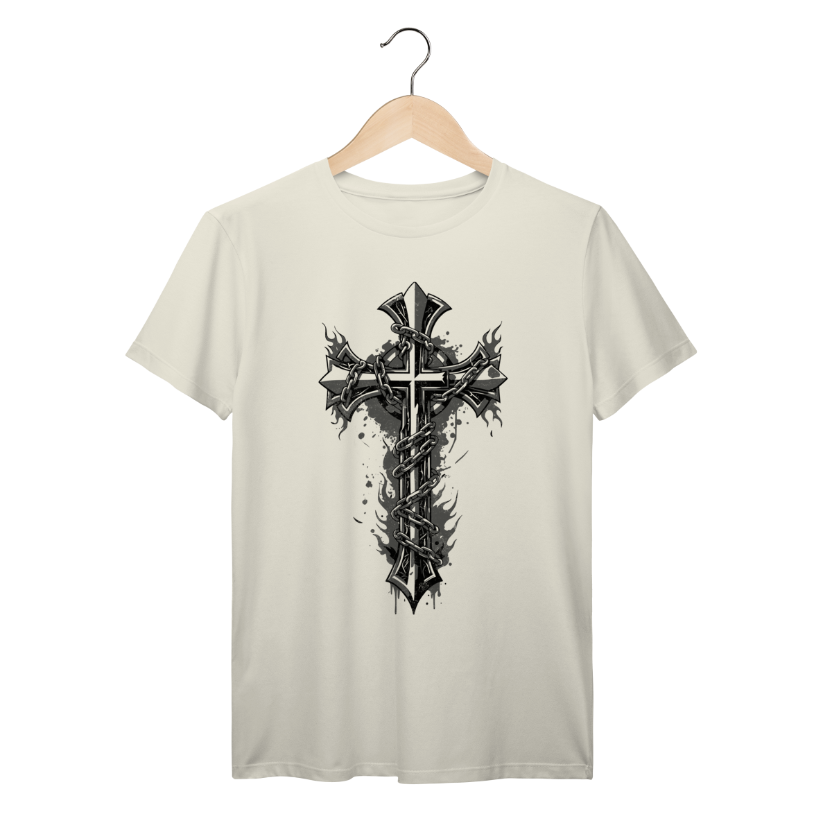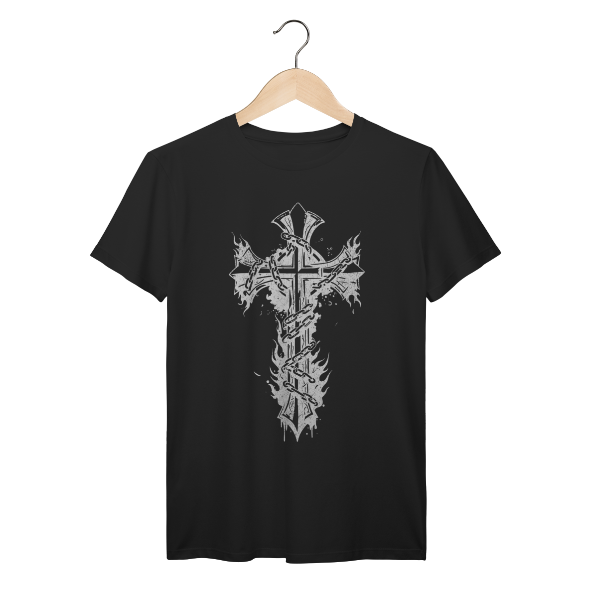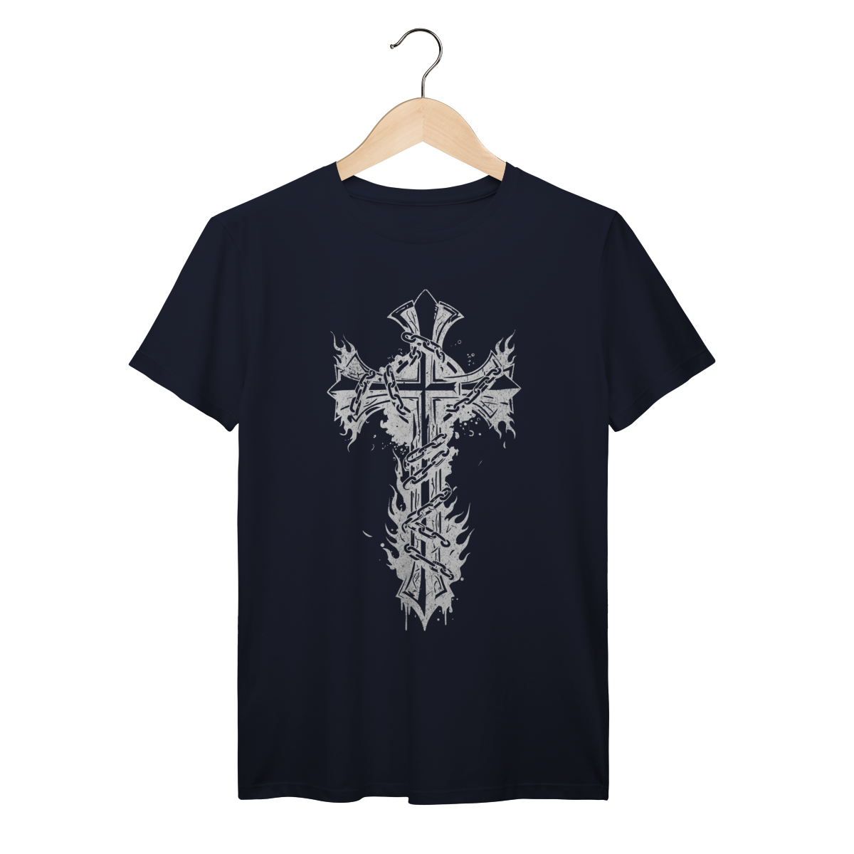 Estampa: A estampa traduz a realidade de quem coloca Deus no comando do guidão. A cruz erguida, mesmo cercada por correntes e pelo fogo das provações, simboliza uma fé que não se curva e não se quebra. É para o motociclista que sabe que o asfalto é perigoso e a vida é frágil, mas que roda com a certeza de que a proteção divina é a sua maior armadura. Uma arte forte para quem tem uma crença forte.