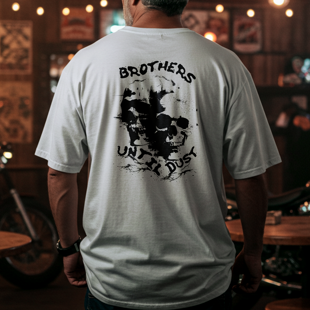 Estampa: Mostre a força da sua irmandade com a camiseta "Irmandade Eterna". Com um design exclusivo de caveiras em estilo grunge e "glitch art", esta estampa expressa a lealdade inabalável entre amigos. Perfeita para motociclistas e amantes do streetwear que valorizam a união. A frase "Brothers until dust" é um tributo à lealdade na estrada e na vida. Disponível em diversas cores e tamanhos.
